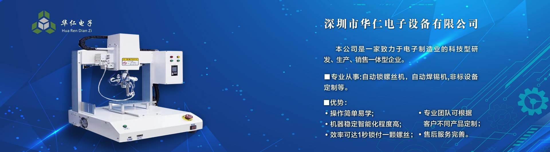 深圳市華仁電子設(shè)備有限公司是一家致力于電子制造業(yè)周邊設(shè)備的科技型研發(fā)、生產(chǎn)、銷售一體的企業(yè),專業(yè)從事:自動(dòng)鎖螺絲機(jī);自動(dòng)焊錫機(jī);非標(biāo)設(shè)備定制機(jī)等,公司長(zhǎng)期以來(lái)在行業(yè)中積累了豐富的經(jīng)驗(yàn),擁有專業(yè)的研發(fā)、技術(shù)、銷售支持工程團(tuán)隊(duì)、各高級(jí)技術(shù)人才為客戶提供優(yōu)質(zhì)產(chǎn)品和服務(wù),同時(shí)不斷吸取國(guó)內(nèi)外先進(jìn)技術(shù),更準(zhǔn)確及時(shí)地為客戶提供優(yōu)質(zhì),性價(jià)比高的產(chǎn)品、公司以專業(yè)的售前、售中、售后服務(wù)贏得了客戶的信賴和好評(píng),為客戶提供先進(jìn)自動(dòng)化設(shè)備一體式解決方案、
